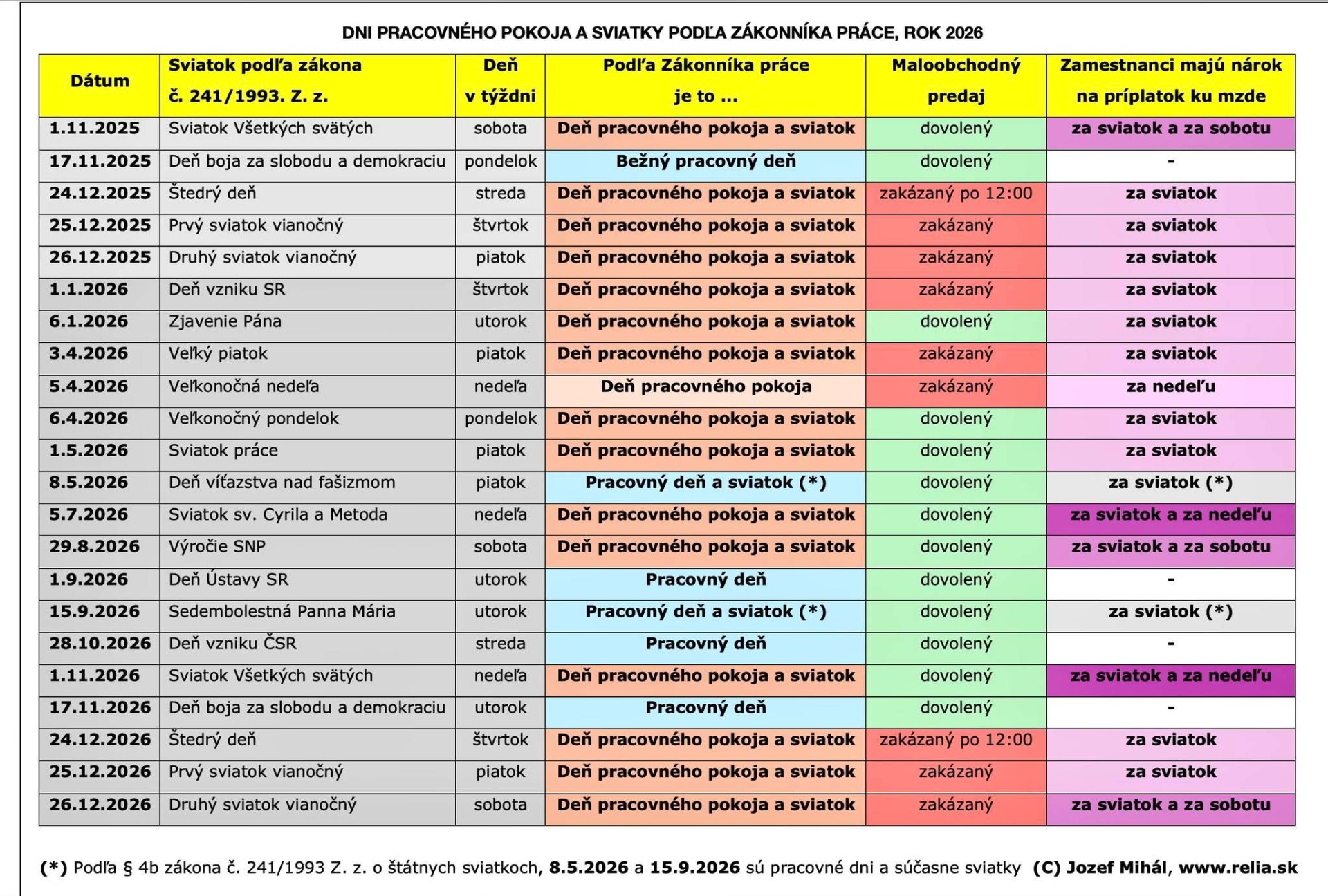V nadväznosti na naše predchádzajúce príspevky pripomíname dôležitosť správneho plánovania pracovného času. Vďaka dátam od uznávaného experta Jozefa Mihála (relia.sk) máme pre vás pripravený detailný prehľad sviatkov, ktoré v roku 2026 ovplyvnia vaše mzdové náklady (najmä sledovaný 8. máj a 15. september).